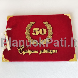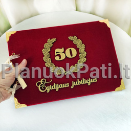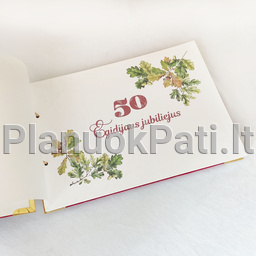 Ąžuolas - tvirtumo, išminties ir ilgaamžiškumo simbolis, kuris neatsiejamas nuo jubiliejinių švenčių. Tokiai reikšmingai žmogaus gyvenimo progai sukūrėme lietuviška simbolika - ąžuolo lapų vainiku dekoruotą palinkėjimų knygą. Ją užsakant kviečiame prisidėti prie asmeniškai jums kuriamo albumo. Jūs galėsite pasirinkti audinio spalvą bei knygos formatą ( A4 horizontalus arba A4 vertikalus formatas). Kartu aptarsime palinkėjimų albumo spaudą, sudarysime jūsų knygai pritaikytą anketą.