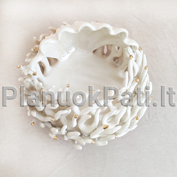 Atlikimo technika: baltas molis, permatoma glazūra, auksavimas, 3 degimai.