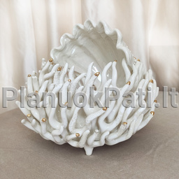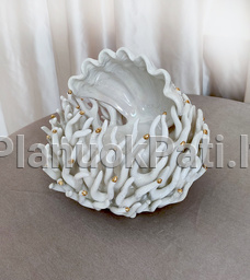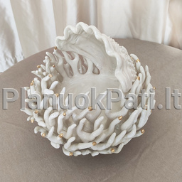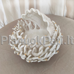 Šeimos židinys - Koralas kriauklėje, išskirtinis neįtikėtinu panašumu į elegantiškuoius elniaragius koralus, tik stilizuotas, tarsi suaugęs su išsiskleidusia perline kriaukle ir galuose papuoštas mažais baltais arba auksuotais burbuliukais, tarsi lašeliais.