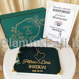 Dekoruota medinė dėžutė į kainą nėra įskaičiuota. Ją galite įsigyti papildomai. Kaina 8 Eur. Tokioje dėžutėje galėsite ne tik saugoti vestuvių palinkėjimų knygą, bet joje taip pat tilps vestuvių atvirukai. Dėžutėje gali būti ir speciali vieta USB laikmenai su nuotraukomis ar filmu (tokios dėžutės kaina 12 eur).