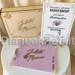 Dekoruota medinė dėžutė į kainą nėra įskaičiuota. Ją galite įsigyti papildomai. Kaina 8 Eur. Tokioje dėžutėje galėsite ne tik saugoti vestuvių palinkėjimų knygą, bet joje taip pat tilps vestuvių atvirukai. Dėžutėje gali būti ir speciali vieta USB laikmenai su nuotraukomis ar filmu (tokios dėžutės kaina 12 eur).