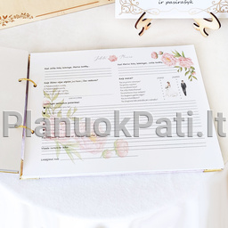 - Anketa "Po vienerių metų" - lapas su voku ir anketa, kurią supildote kartu, įdedate į voką ir šį užklijuojate. Atplėšti galite pirmų vestuvių metinių proga bei prisiminti gražiausias akimirkas iš vestuvių dienos, jūsų norus, geriausius vienas kito bruožus, matytus prieš santuoką ir kt. (2.2 Eur)