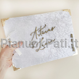 Ši palinkėjimų knyga tiks jauniesiems, kurie ieško minimalizmo ir paprastumo. Subtilus viršelio dekoras dera su švelniu medžiagos aksomu. Dizaine yra tik tai, kas būtina - įamžinti jaunųjų vardai bei šventės data. Užsakant šį palinkėjimų albumą, galite rinktis jums patinkančią viršelio spalvą. Spauda taip pat sudaroma asmeniškai jūsų palinkėjimų knygai. Pateikus užsakymą jums atsiųsime anketinių klausimų sąrašą ir galėsite pasirinkti tuos, kurie jums patinka.