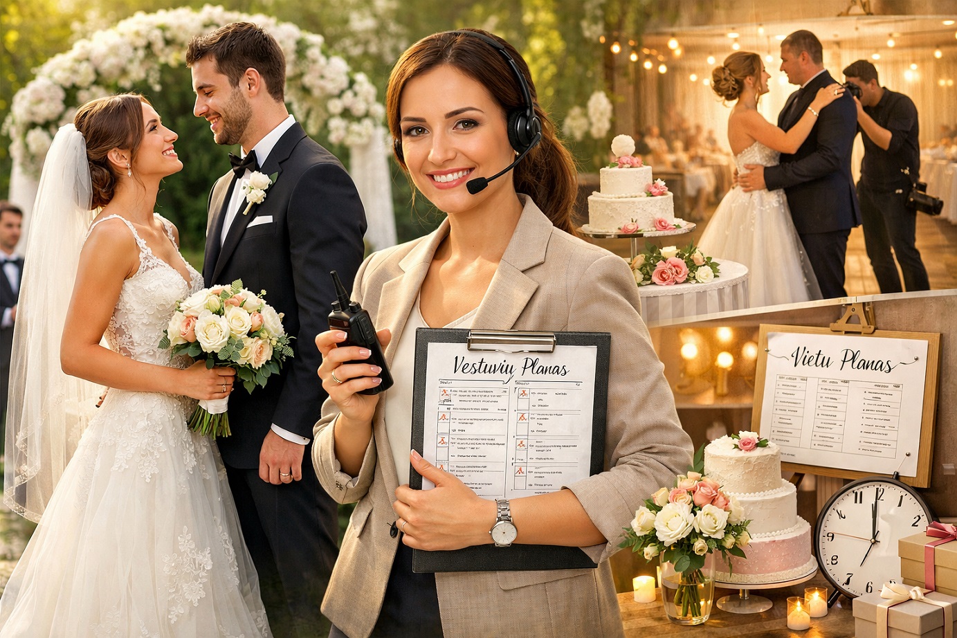 Koordinatorė – įgyvendina planą vestuvių dieną ir užtikrina, kad viskas vyktų pagal grafiką.