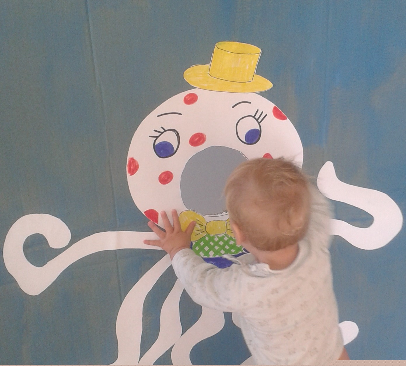 Jums reikės kuo didesnės nereikalingos kartono dėžės, guašo, klijų, didelio teptuko, žirklių bei spalvoto popieriaus. Pirmiausiai pasiruoškite "jūrą" aštuonkojui. Kartono dėžę išskleiskite. Nudažykite ją mėlynu guašu. Leiskite dažams išdžiūti. Kai šis etapas baigtas, kibkite prie aštuonkojo kūrimo. Iš popieriaus iškirpkite didelę galvą. Iš kitų lapų iškirpkite kojas. Dekoravimui iškirpkite kepurėlę, bantelį, bliuskutę ar kas kita šaus į galvą. Pirmiausiai ant kartono priklijuokite galvą taip, kad būsimoji aštuonkojo burna būtų vaikams patogiame aukštyje (nei per aukštai, nei per žemai). Išsidėliokite, o vėliau ir priklijuokite visas aštuonkojo kojas. Dabar klijuokite dekoro detales, kurios paslėps galvos ir kojų sujungimus. Kai aštuonkojis išdžius žirklių ar peiliuko pagalba badydama išpjaukite didelę skylę - burną. Kaip žaisti skaitykite čia.