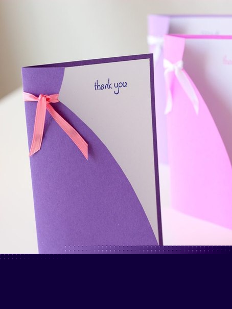 Tokius atvirukus pasigaminti labai paprasta. Jums reikės keleto spalvų spalvoto popieriaus, dailios atlasinės juostelės, žirklių bei karštų klijų. Išsikirpkite suknutės trafaretą. Perlenkite popieriaus lapą pusiau, kad gautumėte norimo dydžio atviruką. Viršelį apkirpkite pagal trafaretą kaip parodyta paveikslėlyje. Šone ties suknutės juosmeniu prapjaukite nedidelę įpjovą, pro kurią prakišite juostelės gabalėlį. Juostelę suriškite, o mazgelį sutvirtinkite karštais klijais. Į atvirutės vidų įdėkite perlenktą baltą lapą su norimu užrašu, tinkančiu Jūsų šventei.