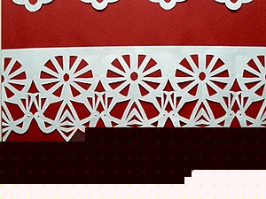 Sulankstykite popierių per pusę, dar kartą ir dar kartą per pusę. Išpieškite norimo rašto fragmentą. Nebijokite eksperimentuoti ir sukurti savo raštus. Atsargiai iškirpkite. Išlyginkite karpinį lygintuvu, kad ne taip matytųsi lenkimo siūlės.