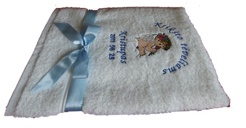 Jums reikės paprastų vienspalvių rankšluostukų (galite naudoti ir virtuvinius) bei siūlų. Kiekvieno rankšluostuko krašte išsiuvinėkite užrašus "Krikštamotei nuo (vaiko vardas)" bei "Krikštatėviui nuo (vaiko vardas)". Bus nebrangi, bet miela dovanėlė, kuri pravers krikštatėviams buityje ir primins apie krikšto vaikelį.