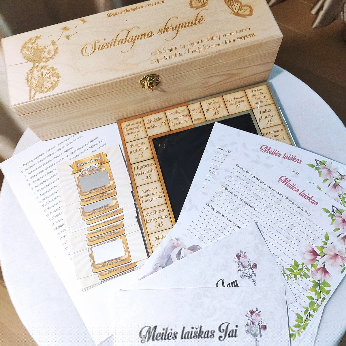 - ąžuolinė kraičio skrynia. Nors piniginės dovanos tampa įprasta vestuvių praktika, bet visada jaunieji po šios šventės turi brangių, sentimentalių dovanėlių ar sveikinimų, kuriuos norėsis pasilikti atminimui. Turėti jų saugojimui specialią vietą - ne tik praktiška, bet ir jautru, ypač jei tokia skrynelė pagaminta iš tradicinio lietuvių vertinamo medžio - ąžuolo, dekoruota jaunųjų vardais.