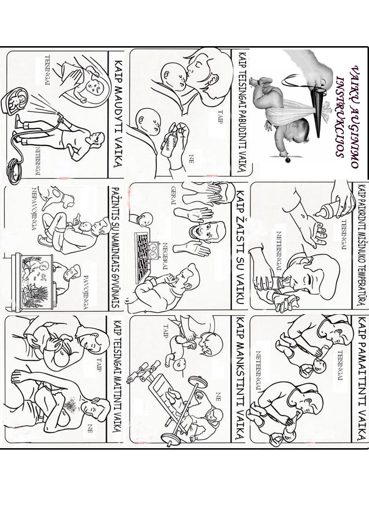 Pateikiame instrukcijas juoko forma, kaip reikia bei kaip nereiktų prižiūrėti vaikelio. Šias instrukcijas galima naudoti krikštynų laikraštuke ar tiesiog iškabinti kaip plakatą, kad visi svečiai galėtų pasižiūrėti.