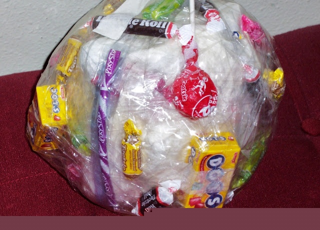 Jums reikės įvairiausių saldainių ir vyniojamos plėvelės. Suvyniokite į kamuolį vyniojamą plėvelę vis įdėdamos saldainių. Paruoškite didžiulį kamuolį. Žaidimo taisyklės labai paprastos: duodate tam tikrą laiką, per kurį kamuolį gavęs žaidėjas gali išvynioti plėvelę, pavyzdžiui, minutę. Kiek saldainių sugeba per tiek laiko išsivynioti, tiek jo. Toliau kamuolį perduodate kitam žaidėjui. Galite surengti ir varžybas, paruošdama kelis tokius kamuolius ir duodama komandoms, kuri pirmoji išvynios savąjį. Vietoj saldainių galima dėti bet kokius kitus smulkius daiktus, riešutus, džiovintus vaisius ir pan.