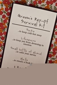 Tokį rinkinuką gali padovanoti tiek vyriausias pabrolys, tiek piršlys ar net pati jaunoji. Jis prajuokins jaunikį ir sumažins įtampą vestuvių dieną. Sudėkite šiuos daiktus: