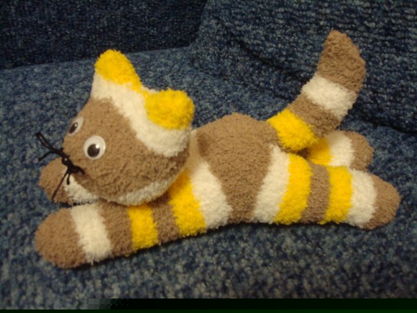 Sukarpykite kojines kaip parodyta schemoje. Paimkite dalį, kuri bus kačiuko galva ir susiūkite vietą, kur bus ausytės. Galvą prikimškite sintepono, kakliuko vietą suraukite. Kūnelio dalį taip pat susiūkite, kad gautumėte keturias kojytes. Galų neužsiūkite kol neprikimšote sintepono. Kimšdama paformuokite, kad užpakaliuko vietoje būtų sintepono prikimšta šiek tiek daugiau. Susiūkite ir prikimškite uodegytę. Prie kūnelio pritvirtinkite galvą ir uodegą. Dekoruokite galvytę: akytes galite tiek prisiūti, tiek priklijuoti karštais klijais.