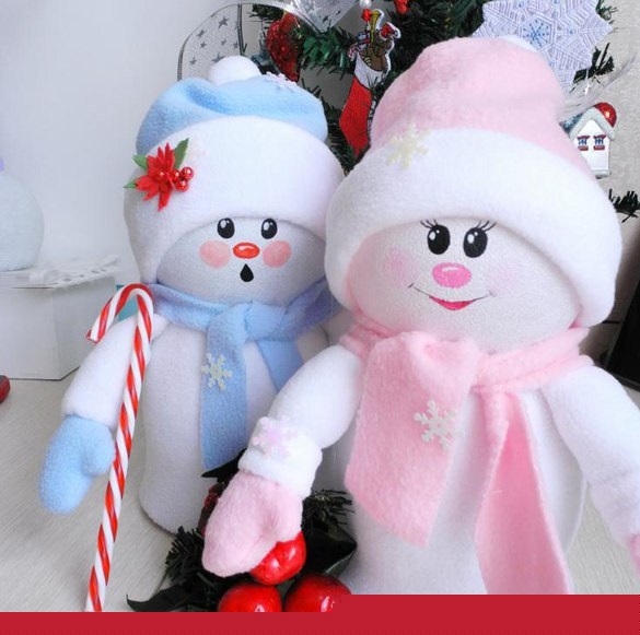 Nuo buteliuko nupjaukite kaklelį. Viršutinę dalį kempinėle padenkite baltais dažais. Gali reikti dviejų, trijų sluoksnių dažų, kad plastikas nebepersišviestų. Išdžiuvus pieštuku nusipieškite sniego senio veiduką ir nuspalvinkite akriliniais dažais. Viską galima padengti laku, bet nebūtinai. Iš vilnos išsikirpkite pagal buteliuko dydį tinkamas rūbelių iškarpas: baltą kūnelį, rankoves ir kepurėlės atlenkimą bei iš kitos spalvos kepurėlę, pirštinėles ir šalikėlį. Butelio apačioje priklijuokite kartono apskritimą, kad figūrėlė būtų stabilesnė. Apmaukite baltu rūbeliu, jį fiksuokite karštais klijais. Klijus tepkite ant medžiagos, o ne ant butelio, kad nuo karščio plastmasė nepasilydytų. Klijuojama ties kakliuku ir apačioje ant kartono. Ties kakliuku priklijuokite rankas. Taip pat klijais pritvirtinkite ir kepurę. Baltą kepurės kraštelį klijuokite ant viršaus prieš tai užlenkusi jį iš vidaus, kad gautųsi dailus atvertimas. Užriškite šalikėlį taip paslėpdama kūnelio ir galvos bei rankų jungtį. Jei dekoruosite žaisliukus smulkmenėlėmis, priklijuokite jas.