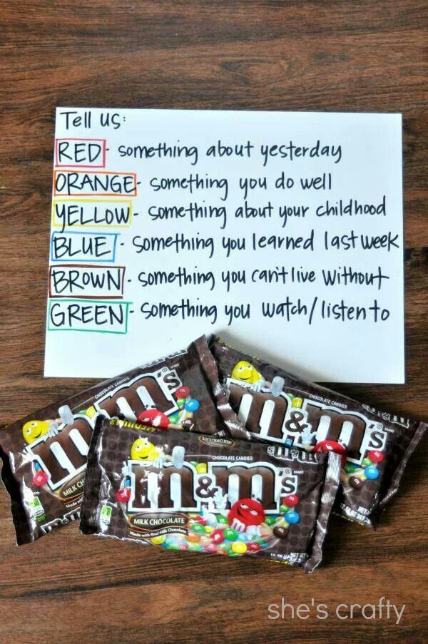 Šiam žaidimui jums reiks spalvotų saldainių, pvz., M&Ms. Paruoškite kortelę, ant kurios bus surašyta, ką kiekviena spalva reiškia. Pvz.: