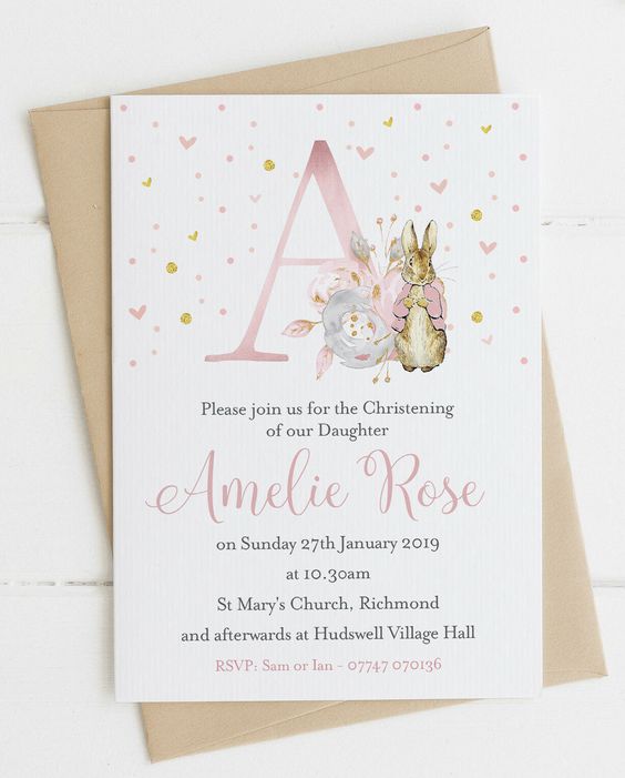 Kartu su savo tėveliais, XXX (mamos vardas) ir XXX (tėčio vardas), kviečiu Jus į savo krikštynas, kurios įvyks šių metų XXX d. (data) XX val. XXX (bažnyčia). Po ceremonijos pietausime XXX (sodybos ar kavinės pavadinimas), adresu XXX. Aš ir mano tėveliai Jums pažadame puikią šventę, kurioje Jūsų lauks šampano taurė, o manęs – stiklinė pieno. Na, o pasivaišinusi aš eisiu miegoti, o Jūs – pasišokti.
