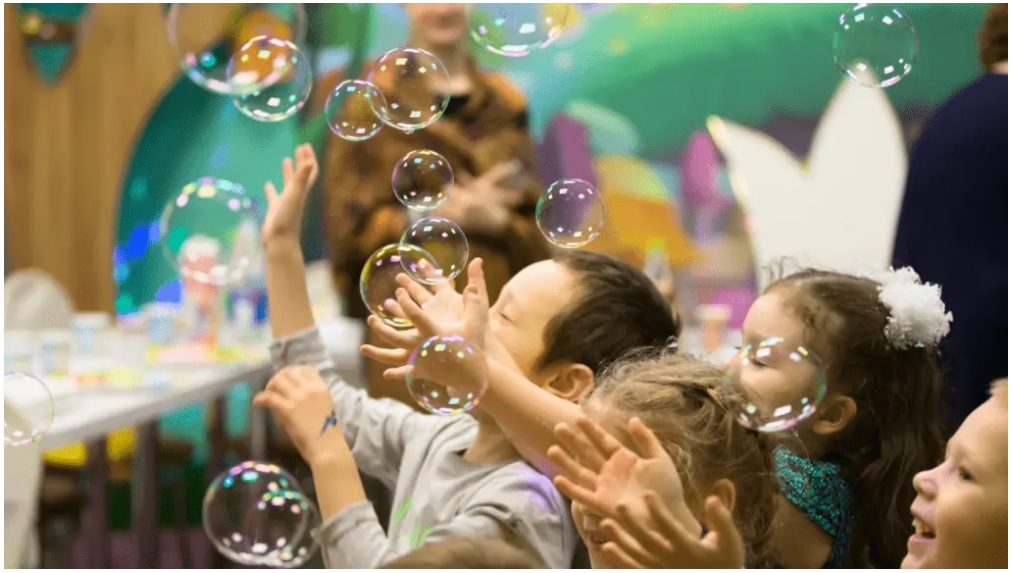 Jei šventė organizuojama šiltuoju metų laiku ir yra galimybė dalį veiklų perkelti į lauką, būtinai taip ir padarykite. Galite vaikams paruošti lazdeles ir muilo burbulų skysčio pūsti dideliems burbulams. Visa tai gan paprasta pasidaryti ir patiems. Nusipirkite pagaliukų, virvelės ir apie 5-7 cm skersmens žiedų, iš kurių pasigaminsite lazdeles burbulams daryti. Šių priemonių rasite statybos, sodo ir laisvalaikio prekių parduotuvėse (pvz. senukai). Burbulų skysčio rekomenduoju nusipirkti, nes gamintas iš indų plovimo skysčio ir glicerino nėra toks kokybiškas. Reikiamų skysčių didesnėse talpose pirkti rasite internete. Tokia veikla leis suaugusiems ramiau pasišnekučiuoti, o vaikai garantuotai bus susidomėję ja. Be to, turėsite ir gražių nuotraukų.
