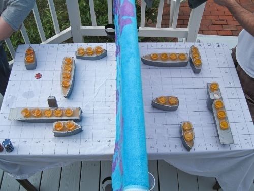 Štai tokį žaidimą galite suorganizuoti žaisti savo šventės metu. Jam reikės staliuko, ant kurio būtų užtiesta vienkartinė staltiesė su subrūkšniuotais langeliais (po 10 langelių ilgio ir pločio kiekvienam žaidėjui). Pasiruoškite laivus. Tai gali būti vienkartinės taurelės, keksiukai, baronkos ar bet kas, ką sugalvosite. Žaidėjai sudėlioja savo laivus į langelius: vienas keturvietis laivas, du triviečiai, trys dviviečiai ir keturi vienviečiai. Nepamirškite tarp žaidėjų padaryti sienos (iš užtiesalo ar didelio popieriaus lapo), kad šie nematytų priešininko laivų. Pradėkite žaidimą - tegu žaidėjai šaudo vienas kito laivus. Nušovęs gauna ant langelio buvusį prizą - išgerti gėrimo, keksiuką ar pan.