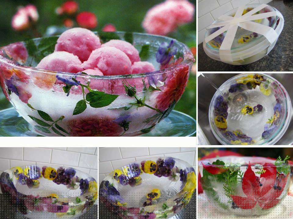 Pirmąjame dubenėlyje išdėliokite norimą gėlių raštą. Kad gėlės nenukristų, iš pradžių dekoruokite tik dubenėlio dugną. Įpilkite truputį vandens. Įkelkite antrą dubenėlį į pirmojo vidų. Dabar atsargiai prikiškite gėlių žiedų tarp abiejų dubenėlių. Taip dekoruosite ledinio indo kraštus. Antrąjį dubenėlį lipnia juosta pritvirtinkite prie pirmojo kaip parodyta paveikslėlyje (kad vanduo neiškeltų dubenėlio per aukštai). Atsargiai užpilkite tarpą tarp dubenėlių vandeniu bei dėkite į šaldymo kamerą, kad sustingtų. Sušalus ledui abu indus nuimkite ir turėsite ledinį dubenį, dekoruotą gėlėmis. Nepamirštkite, kad jis greitai tirpsta, todėl jame patiekite greitai valgomą, šaltą maistą, pavyzdžiui, šerbetą.