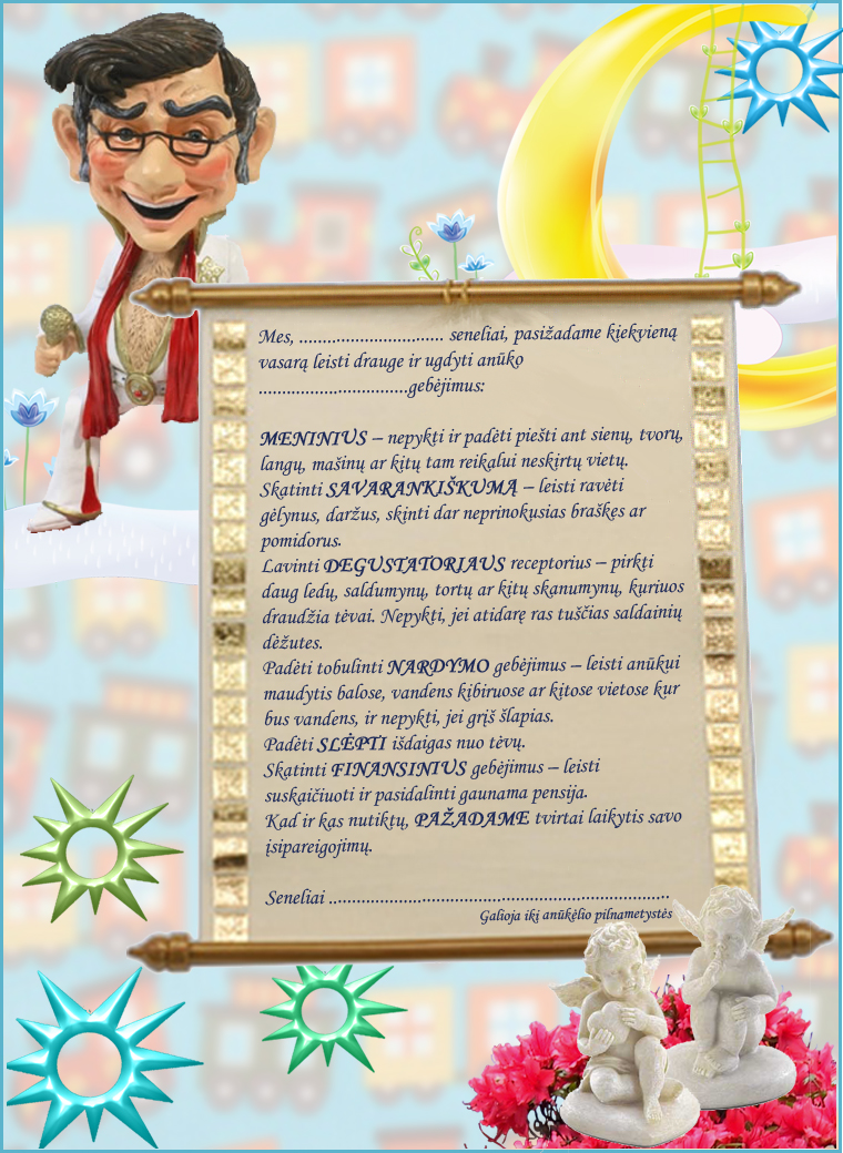 Mes, ............(vaiko vardas) seneliai, pasižadame kiekvieną vasarą leisti drauge ir ugdyti anūko ............. (vaiko vardas) gebėjimus: