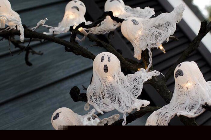 Pirmiausia pradurkite kamuoliukuose skyles, kad į vidų galėtumėte įkišti lemputes. Ant kamuoliukų markeriu nupieškite vaiduokliukų veidukus. Į skylutes įkiškite susukto popieriaus. Taip padaryti reikia, kad vaiduokliukai būtų aukštesni ir galėtumėte gražiai išformuoti jų suknytes. Pasiruoštkite indą su klijais. Į jį merkite marlės kvadratėlius po vieną. Merkite taip, kad panirtų kvadratėlio centras, o kraštai nepasidengtų klijais (kad nepriliptų prie kiaušinių dėklo). Klijuokite marlės gabalėlius ant kamuoliukų ir palikite išdžiūti. Galiausiai ištraukite popierius ir į skylutes kamuoliukuose sukaišiokite Kalėdines lemputes. Tokia girlianda galite puošti tiek šaką, tiek langą ar bet kurią kitą namų vietą.