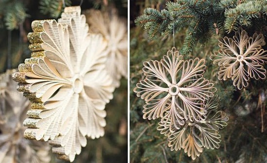 Pirmiausiai pasiruoškite snaigės lapeliams juosteles. Tam reikės susikarpyti apie 2 cm pločio juosteles. Imkite iš karto keletą lapų, kad snaigė atrodytų gražesnė. Vienam lapeliui reikia vienos ilgos juostelės ir po dvi trijų skirtingų ilgių trumpesnių juostelių. Padarykite iš jų kilputes ir sudėkite į vėduoklę, kaip parodyta paveikslėlyje. Vėduoklės galą suriškite ir laikinai prispauskite, kad neiširtų kol gaminsite kitus lapelius. Jų iš viso reikės aštuonių. Viduriukui pasidarykite apskritimą iš juostelės. Pasiruoškite karštus klijus. Gerai patepkite vėduoklės galą ir klijuokite prie apskritimo. Iš pradžių klijuokite kryžiumi keturis lapelius, vėliau simetriškai į tarpus įklijuokite likusius. Snaigės išorinius kraštelius galite papuošti priklijuodama blizgučių.