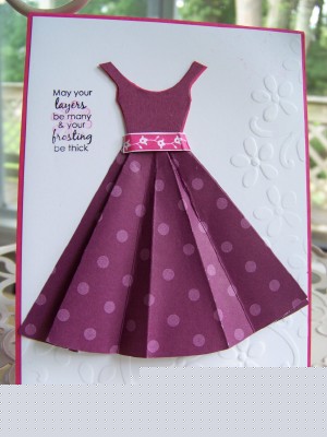Išsikirpkite suknutės sijoną ir bliuskutę pagal duotą trafaretą. Suknutę sulankstykite per linijas. Iš storesnio popieriaus iškirpkite sijono formos pagrindą, kuris būtų tokio pločio, kaip jau sulankstytas sijono priekis. Belieka sijono priekį ir bliuskutės priekį priklijuoti prie kietesnio pagrindo taip, kad sijono dalis atsilenktų per juosmenį. Juosmenį dekoruokite taip paslėpdama suklijavimo vietą. Kai atvirutė baigta ir klijai išdžiūvo, įrašykite jos vidinėje pusėje norimą tekstą.