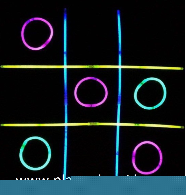 Šis žaidimas puikiai tiks jei planuojate surengti tamsoje švytinčią šventę. Jums reikės šviečiančių lazdelių ir susegimų joms. Iš lazdelių išdėliokite žaidimo lentą. Paruoškite dviejų spalvų žiedus. Vienas žaidėjas gauna vieną spalvą, kitas - kitą. Žaidžiama kaip ir įprastiniai kryžiukai nuliukai. Kiekvienas žaidėjas paeiliui deda savo žiedą į pasirinktą tuščią kvadratą. Reikia dėti taip, kad kuo greičiau surinktumėte savo spalvos liniją horizontaliai, vertikaliai arba įstrižai. Tuo pačiu reikia stengtis užkirsti kelią, kad priešininkas nesurinktų tokios linijos pirmas.