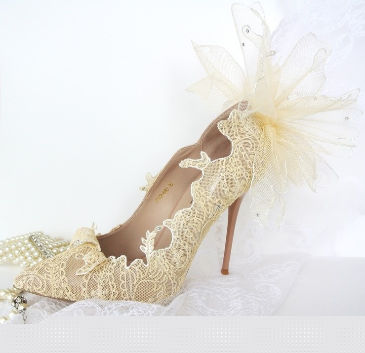 Jei nėriniai nėra tos pačios spalvos kaip bateliai, iš pradžių juos nudažykite akriliniais dažais ir kempinėle. Kai medžiaga paruošta, dedame ant batelių ir deriname, kad nėrinių piešinukas būtų jūsų norimoje vietoje. Tada klijuojame medžiagą pradėdamos nuo batelių išorinės pusės. Klijavimui tinka bet kokie skaidrūs, drėgmei atsparūs klijai, pavyzdžiui, moment kristal klijai. Klijams gerai išdžiūvus mažytėmis žirklutėmis nukerpame medžiagos perteklių ties bato padu. Įkerpame medžiagos gabalėlį ties batelio kulniuku ir priklijuojame dailiai ties siūle. Medžiagos visiškai nenukerpame, nes dar reikės suforrmuoti bato nosį. Klijuojame kaip parodyta paveikslėliuose. Klijams išdžiūvus apkerpame batelio vidų. Kad nėrinukai išlaikytų formą, tas vietas, kurios nepriklijuotos ant bato, patepkite bespalviu matiniu laku vandens pagrindu. Jam išdžiūvus visus kraštelius apvedame akriliniu kontūru. Pasiruošiame tiulio stačiakampį maždaug 20x40 cm. Suraukiame taip, kad viršutinė dalis būtų šiek tiek didesnė už apatinę. Karštų klijų pistoletu priklijuojame tiulį prie batelio. Padarome dar vieną stačiakampio raukinuką, tik šį kartą suraukiame lygiai ties viduriu. Priklijuojame prie batelio, tik dabar raukinuko galai turi eiti horizontaliai (priešingai nei prieš tai klijuoto raukinuko). Žirklėmis nudailiname tiulinio burbulo kraštus, kad šis vizualiai būtų apvalus. Kraštus dekoruojame akriliniu kontūru. Pabaigai priklijuojame keletą kristaliukų.