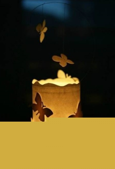 Iš vielutės išlankstykite pakabą drugeliams ir pritvirtinkite prie stiklainio. Pakabinkite kelis drugelius. Iš popieriaus padarykite stiklainio šonų dekorą: vieną popieriaus kraštą dailiai apkirpkite bangelėmis, priklijuokite drugelius taip, kad jų sparneliai būtų atlenkti nuo lapo (taip jie mes gražų šešėlį). Jei viskas jau paruošta, belieka laukti vakaro ir įžiebti žvakę. Vietoj drugelių galite pasirinkti kitus šventei tinkamus paveikslėlius: angelėlius, snaiges, balandžius ir panašiai.